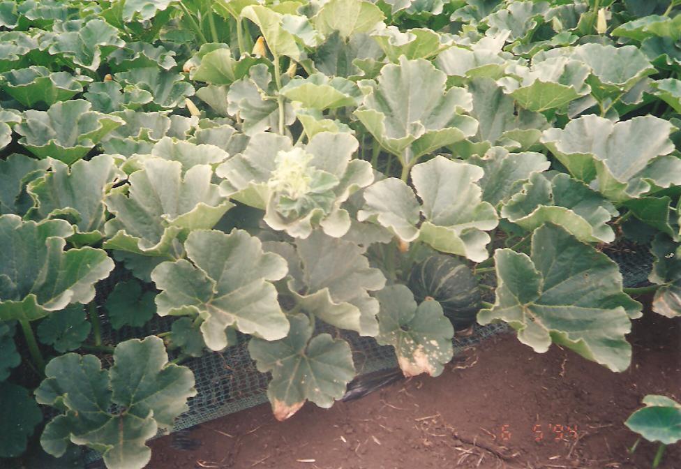 Az édeskrumpli, eper, dinnye és a kis kerek sütőtök 60-80 cm széles ágyásai közvetlenül a földön, fekete műanyag fóliával voltak beborítva. A dinnye és a sütőtök fóliájára még műanyag hálót is raktak, hogy az indák könnyebben futhassanak. Lyukak voltak a fólián, ott dugták be a palántákat, melyeknek a gyökerei így a fólia alatti földben vannak, a növény pedig a fólia feletti szabad levegőn fejlődik. Így az eprek, a dinnye és a sütőtök a fólián fekszenek és nem lesznek piszkosak.
